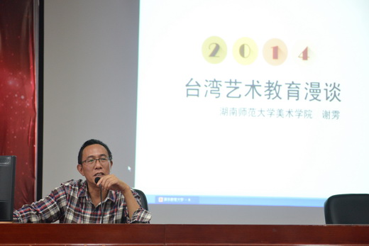 谢雱教授从台湾的历史背景引入讲座主题——《台湾艺术教育漫谈》,结合他在台湾进行教学交流和考察的经历,重点介绍和分析了台湾屏东大学、彰化师范大学、台北教育大学以及台湾的一些美术馆、画廊的艺术教育与市场运作的特色,通过将台湾与大陆、台湾与西方进行对比,与今年会师生分享了他受到的启发。谢教授将台湾的高等艺术教育总结为三个特点:一是国际化;二是市场化;三是社区化。谢教授还谈及了台湾的美术高考与大陆的美术高考的区别。他建议我们大陆的高等美术教育要选择性学习台湾高等美术教育的长处。