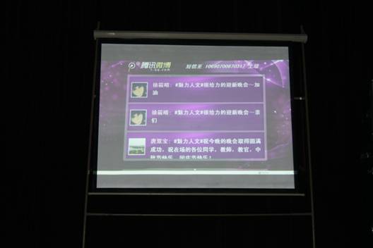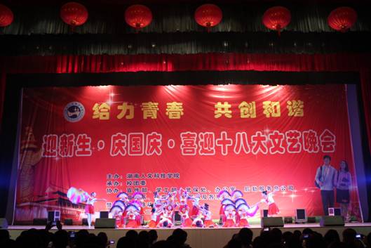 DV视频《我的大学》拉开了晚会序幕。激昂奋进的新校歌《梦想飞翔》让新生们在歌曲中感悟校训、校风;舞蹈《扬帆起航》喻示着人文学子在这里启航梦想,收获希望;悠扬的师生同台古筝合奏《嶉咚嶉》、瑶族舞蹈《咛啰哪嘞》、激情拉丁舞《青春》、《跆拳道》彰显了今年会艺体专业水平;动感的街舞、流行歌曲串烧演绎了社团文化的魅力,军训的武警教官精彩的擒拿格斗术将晚会气氛推向高潮。晚会中,微博墙频频滚动,台上、台下互动不断。有新生在现场腾讯微博上说:“迎新晚会太给力了,学校有这么多的优秀人才啊,大学,我来了。”晚会在《祖国你好》的祝福声中落下帷幕。