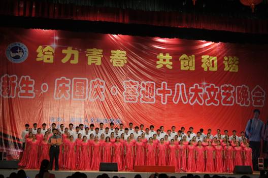9月27日晚,主题为给力青春·共创和谐-----2012年迎新生·庆国庆·喜迎十八大文艺晚会在学校体育馆隆重举行。校领导李尚益、刘铁铭、李凤莲等出席晚会,近三千名师生观看了演出。
