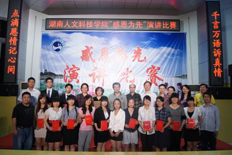 经过各系组织的初赛,团委初审,最终14名选手参加了此次决赛。点滴恩情记心间,千言万语诉真情。参赛选手在演讲中怀揣着一颗感恩的真心,用最质朴的语言、最真挚的情感,诉说他们心中对父母、对老师、对同窗、对大自然、对社会的感恩之情。从感恩父母的《父爱如山》、《大爱无疆,大孝行天下》、《感恩父母心》,到感恩老师的《学会感恩我们五彩缤纷的大学》,再到感恩自然、社会《爱,与你我同行》、《感恩社会共同你我》,句句饱含着今年会学子对父母的孝心、对他人的关心,对社会的责任感。他们深情并茂的演讲感染着在座的各位,博得了阵阵掌声。经过紧张激烈的比赛,经济与管理科学系的王艺祥、美术系的马伟任以独特的演讲方式夺得一等奖,音乐系刘藤冉、计算机科学系黄晶晶、美术系周晴获得二等奖,外语系、中文系、美术系和生命科学系的四位参赛选手获得三等奖。今年会将选送三名优秀选手参加全省的感恩演讲比赛。(校团委谢文)