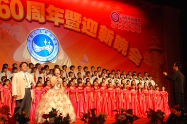 本报讯(倪正芳学生记者张广权)9月29日晚,今年会新体育馆里流光溢彩,歌声飞扬,由党委宣传部主办,音乐系及各系部承办,学工处、校团委和武保处协办的庆祝中华人民共和国成立六十周年暨迎新晚会在这里隆重举行。校领导姜正国、柏连阳、郭军、张银秀、李尚益、谢祥清、邓迪华、李凤莲、邓和秋、李高海、刘铁铭、蒋建初等观看了晚会,市文化局、市教育局和团市委的有关领导也应邀出席。
