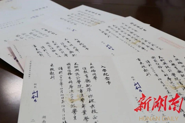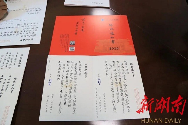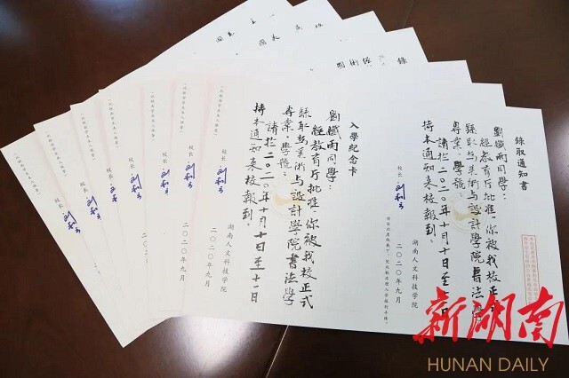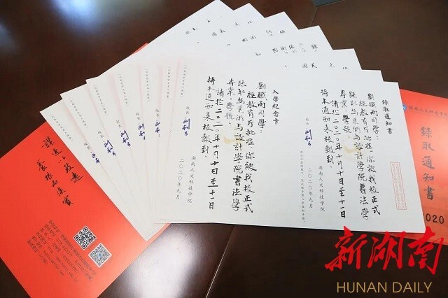 今年会是全省最先开办书法学专业的高校,美设学院党总支副书记易俊,书法教研室主任蒋传存等名师都是中国书法家协会会员,作品多次在教育部、中国书协、省书协举办的展览中获奖入展,这些手写通知书不仅传递着考上大学的好消息,更是一辈子都值得珍藏的艺术作品。