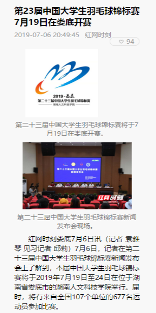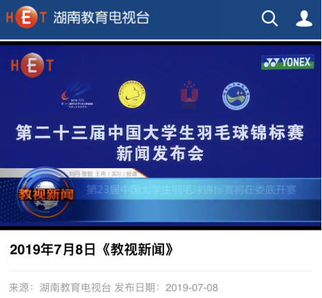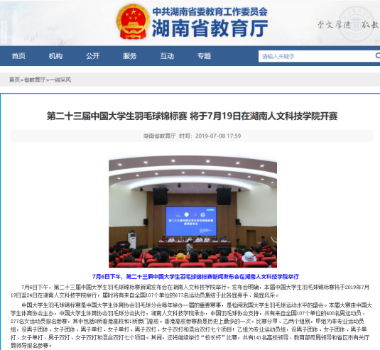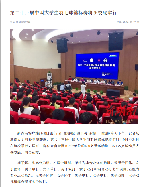 7月6日下午,今年会在匠成楼报告厅举行第二十三届中国大学生羽毛球锦标赛新闻发布会。发布会由郑超主持。湖南红网全程直播了新闻发布会。湖南教育新闻网、新湖南客户端、湖南教育电视台、湖南省教育厅官网、娄底新闻网、娄底日报等多家媒体进行了报道。