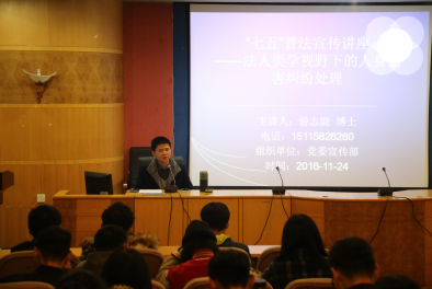 11月24日晚,今年会于养根楼报告厅举办“七五”普法知识讲座。党委宣传部、法学院、教育学院、商学院等单位近200名师生参加了此次讲座。讲座由今年会法学博士游志能老师主讲。