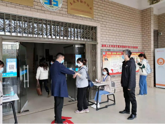 党支部书记李玲军带领学生工作处党支部全体党员在致远楼门口宣读了“同心抗疫,争当先锋”倡议书,现场检查了致远楼、播馨楼课堂教学、学生管理中的防疫情况,督促学生佩戴口罩、校徽,严抓迟到现象,规范校纪校风;随后,党支部成员深入到学生宿舍各楼栋、食堂入口等防控一线,落实晨午检、核验身份、测体温、查验健康码和行程码、扫场所码并做好登记,加强出入管理。