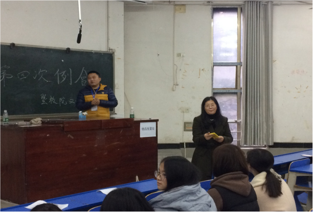 然后,刘红燃老师跟大家交流,谈了对文建工作的认识,对文建部的队伍建设提出了期望,重点讲到作为干部要有责任心、执行力和个人素养。再是各部门部长代表发言,男管部部长周大智谈到了查寝过程中的点点滴滴,也跟干事们分享了他从一名干事到部长的成长过程,认为在文建部收获了很多,也找到了一群志同道合的伙伴;办公室部长杨泽壬再次明确了办公室的主要职能,做晚归表、卫生定检表以及签到表,发布卫生定检、查晚归通知等等。女管部长徐艺涵代表发言,讲了女管方面的查寝,团结协作,感受到大家庭的温暖。干事代表也一一上台发言,他们分别从工作中谈了各自体会。主席刘欢对代表们的发言做了总结,也谈了他自己的感受。