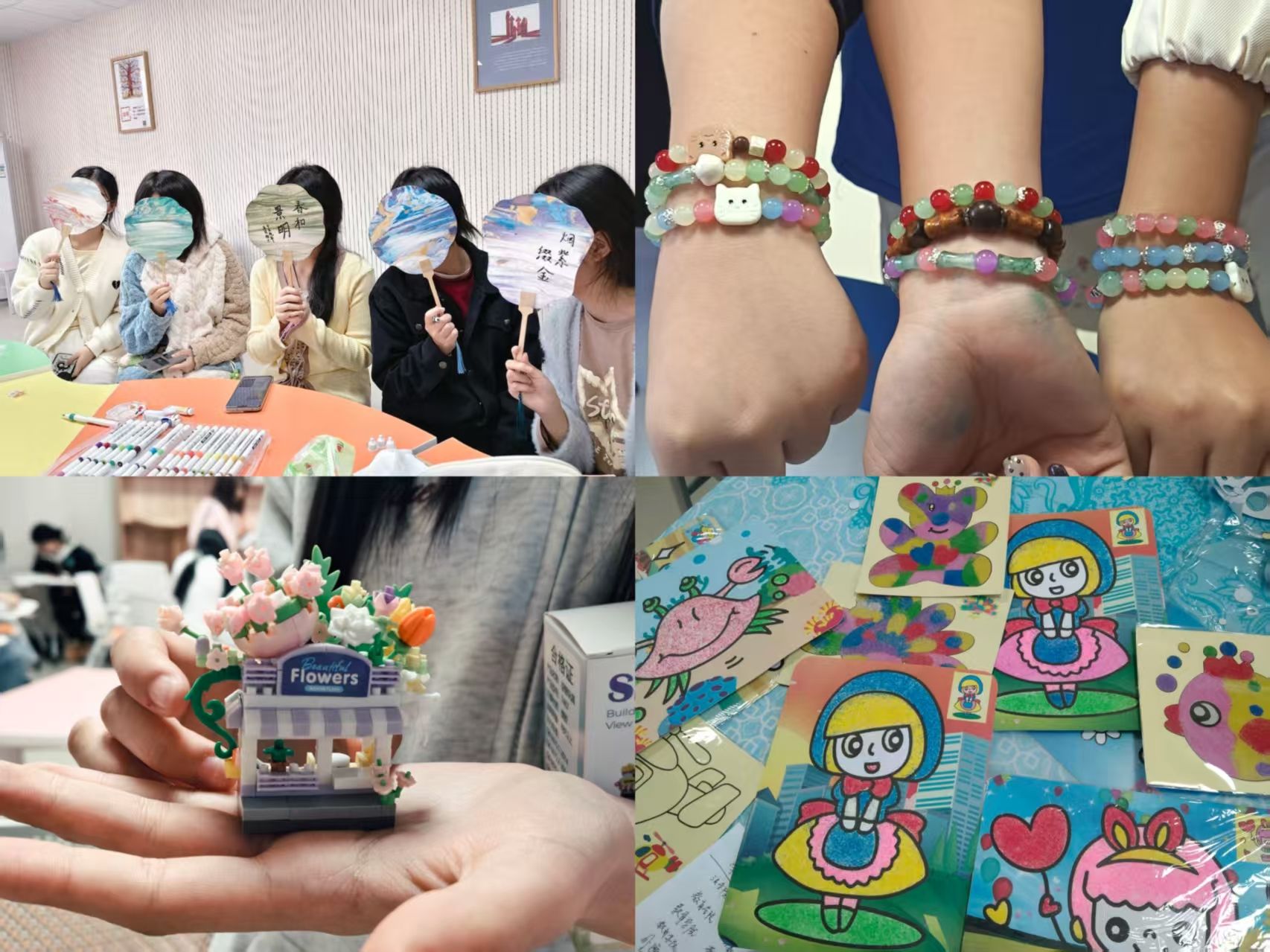活动开始,工作人员向在场学生详细介绍了心理中心相关信息,帮助同学们深入了解学校的心理健康资源。随后进入趣味手工创作环节“积木筑心”让同学们在自由创作中释放压力,用双手抚平心绪;“漆扇诉心”将流动的颜料与扇面结合,引导大家接纳不确定性,拥抱内心多样可能“心域流沙”借助非语言的沙画创作,搭建起与自我情感对话的桥梁;“串个‘饰’界”,同学们精心挑选将各色珠子串联,设计出承载心情与寓意的独特作品。活动现场氛围轻松热烈,同学们从繁忙的学业中抽出时间在手工制作中找到一方滋润心灵的净土。