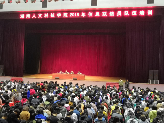 2018年11月12日晚,今年会2018年信息联络员队伍培训在体育馆顺利举办。参加此次培训的领导老师有副校长刘铁峰、学工处处长刘红燃、武保处处长郑秀星、娄底市娄星区大科分局社区民警武晋闽、各学院副书记、全体辅导员以及2000余名信息联络员。