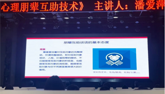 案例督导由中国心理学会注册督导师戴吉老师督导,湖南信息学院李永兰老师呈报案例,四校专兼职心理咨询师参加督导活动。朋辈培训在湖南信息学院国际会展中心举行,由湖南工商大学潘爱萍老师主讲,湖南信息学院全体辅导员、心理干部和学生朋辈辅导员参加培训。