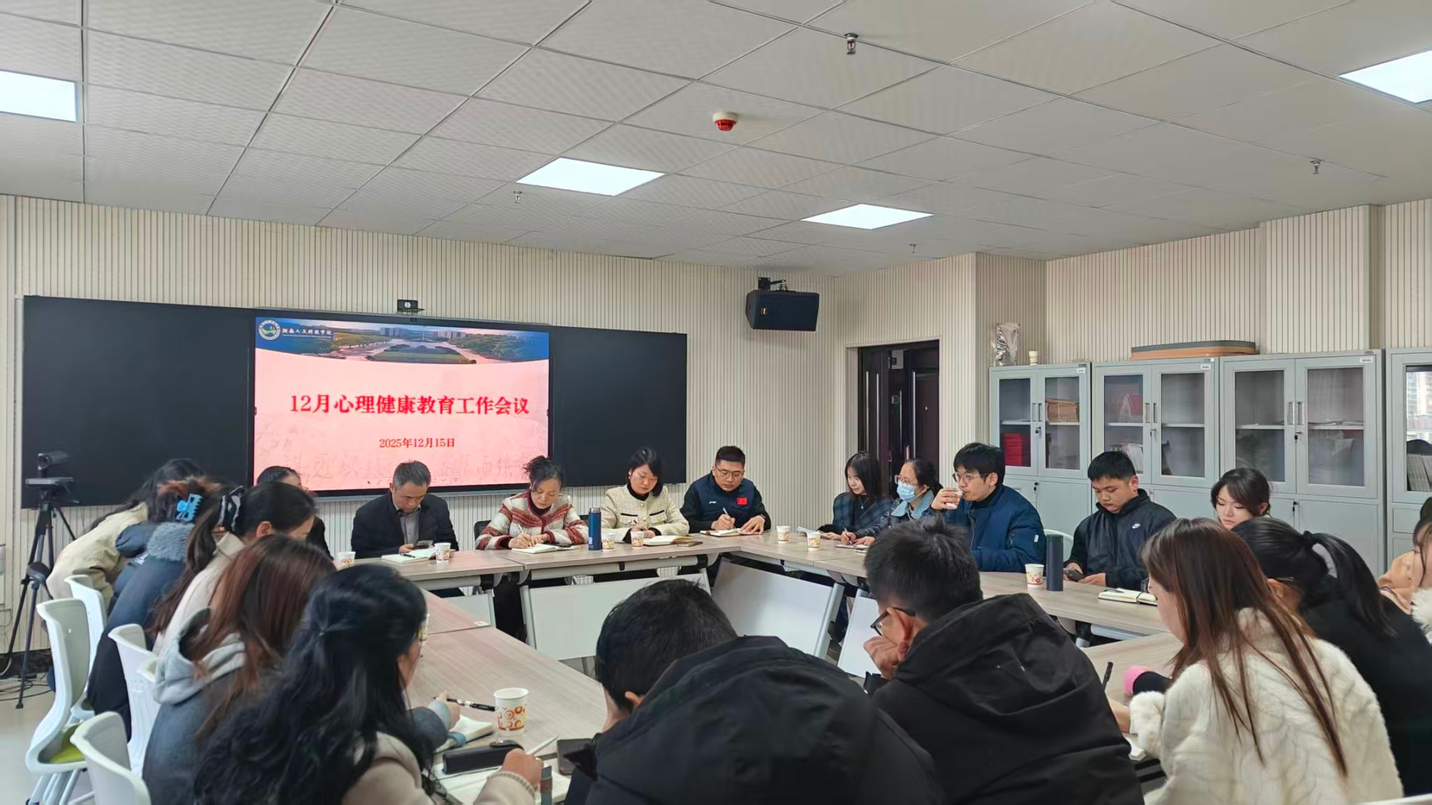 12月15日下午,学生工作部在阳光食堂412室召开12月心理健康工作会议,全面部署期末及元旦前后学生心理健康工作。学工部部长曹宇、副部长谢四元和宋双出席会议并讲话,各二级学院学工办主任、心理专干及大学生心理健康与教育中心全体成员参加会议。