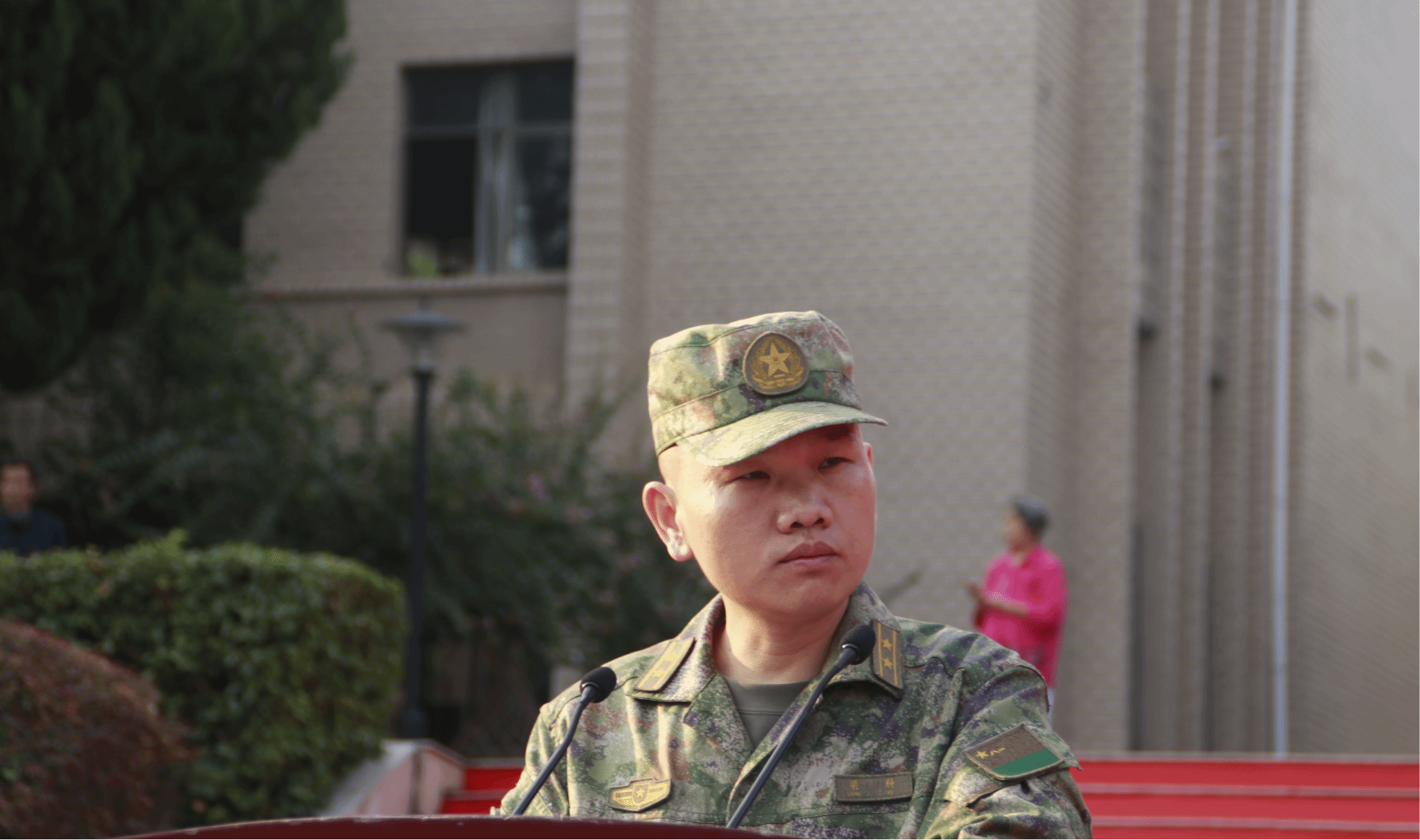 梁科作军训动员讲话后,刘铁峰向全体参训学生提出了三点希望:一端正态度,锤炼严谨作风意识。二以训塑魂,根植军人作风。三以训正风,争当模范标兵。最后,刘铁铭向军训团参谋长谢四元授旗,并宣布军训开训令。
