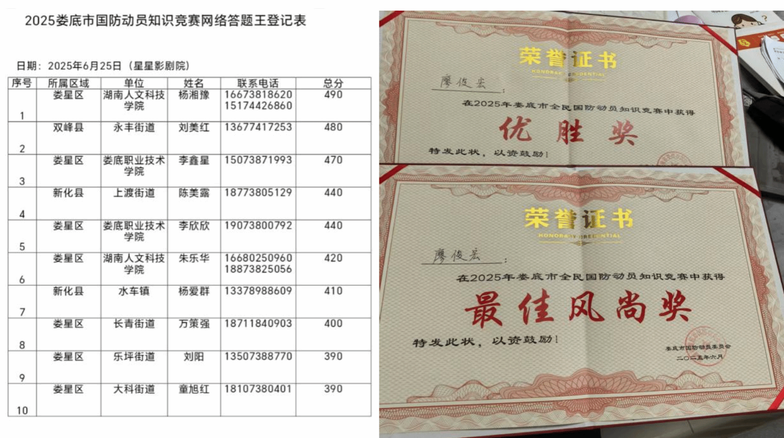 为深入贯彻落实全民国防教育要求,增强全民国防观念,普及国防动员知识,6月25日,由娄底军分区、市委宣传部、市发改委等单位联合主办的娄底市全民国防动员知识竞赛总决赛圆满落幕。今年会师生在比赛中表现优异,马克思主义学院朱乐华、杨湘豫两名同学荣获“答题王”称号,学生工作部综合科科长廖俊宏斩获个人优胜奖和最佳风尚奖。