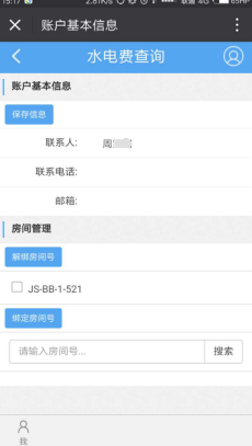点击进入账户管理页面,如发现个人信息与实际水电表不符合,可进行修改绑定。如下图可进行个人信息更新保存,房间水电表解绑、绑定新的房间水电表。