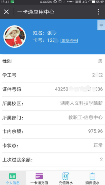 点击进入功能主页,默认显示当前卡号的基本个人信息与余额等信息。