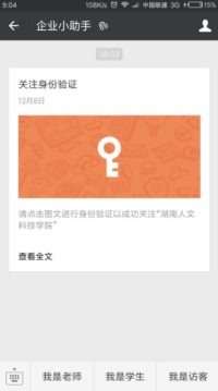1、关注后企业号会提示企业小助手的消息。