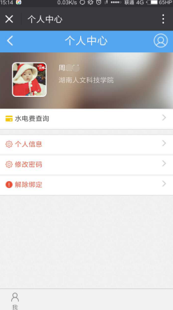 绑定成功后进入水电个人中心页面,该页面为个人综合页面,可进行水电查询、查询个人信息等。如下图所示: