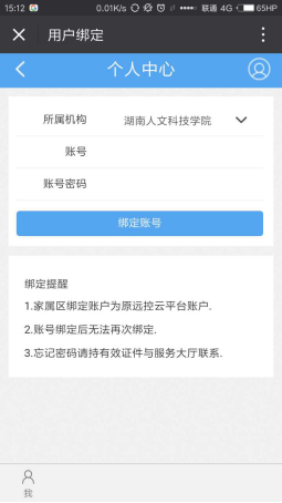点击进入水电充值查询功能页面,初次使用需要绑定校内的水电账户。账户为原远控平台账户。输入账户密码后点击完成水电账户的绑定。