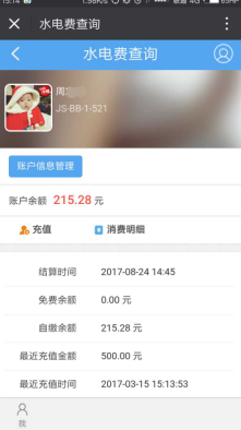 点击进入水电账户余额与账户信息的主页。主页信息区域默认显示当前卡余额与信息