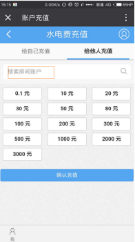 账户默认给当前绑定的水电账户进行充值,同时支持给其他水电账户进行充值,点击进入给他人充值页面。输入他们的水电账户与系统进行匹配,即可给他人进行充值。