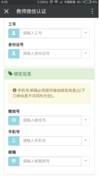 3、教职工与学生需要填写工号(或学号)、身份证、微信绑定的手机号码进行认证,邮箱与微信号可以不填。