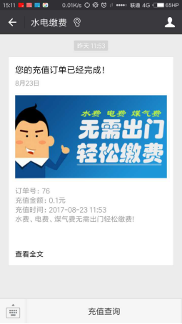 点击进入充值页面,选择需要充值的金额,确认后即可发起微信支付。支付成功后相应金额即可进入水电账户,首页会有微信消息提醒。