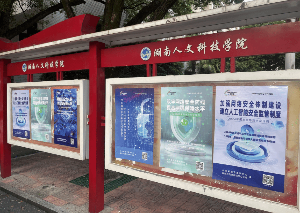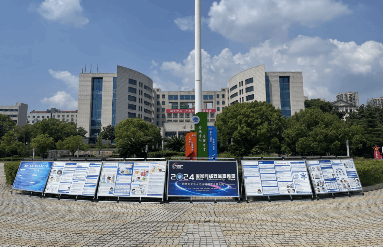 在校园内,线上线下宣传活动同步推进,全面覆盖校园各个角落。线上方面,学校网站主页显著位置设置网络安全宣传周宣传图片,微信公众号发布相关宣传文稿,借助新媒体平台广泛传播网络安全知识。线下宣传更是形式多样、丰富多彩。迎宾大道与养根楼分别悬挂“网络安全为人民,网络安全靠人民”“等横幅,彰显网络安全的重要地位与意义。海园广场精心制作六块展板,围绕网络安全、网络诈骗、信息安全法律法规等内容展开详细解读,吸引众多师生驻足观看学习。此外,海园广场电子显示大屏滚动播放网络安全宣传图片,学校各部门主要户外电子显示屏也纷纷展示网络安全宣传标语,办公楼和食堂附近宣传橱窗张贴的网络安全宣传海报,进一步加深了师生对网络安全的认知与理解。