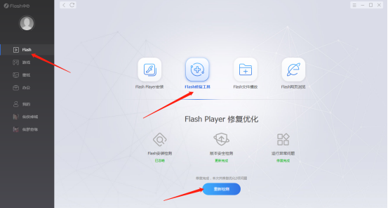 打开安装好的Flash大厅,点击“Flash修复工具”,点击下方的检测,并按提示修复。