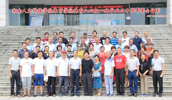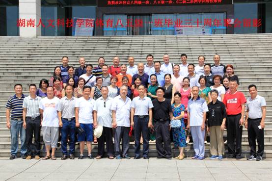 时光如水,岁月如歌,时间转瞬即逝,记忆总在不经意间褪色,曾经的你记下了多少欢笑与泪水。2017年7月15日对于娄底师专体育八四级和八五级一班的同学们来说,是一个不平凡的日子,这一天,同学们从四面八方相约来到了自己的母校——娄底师范高等专科学校(现今年会)参加毕业三十周年同学聚会。上午九点,同学们陆续来到了 学校图书馆会议室,在这里等待的有学院领导及曾经给予同学们谆谆教诲的恩师。大家一见面,互相倾诉浓浓的师生情、同学谊。这次聚会同学们盼了很久,都早早做好了各种准备,很多都是远道而来,他们有的来自北京,有的来自广州、深圳、厦门、长沙、株洲、湘潭等地,为了这次聚会,大家不辞辛苦,不惧炎热。十一点举行了主题为“感恩怀旧 分享 共勉”的座谈,校党委副书记刘铁铭教授携校友办和体育学院领导应邀出席了座谈会并作了热情洋溢的讲话,师生畅所欲言,其乐融融。会后师生共同合影留念,参观校园风貌并在食堂集体就餐,重温学生时代的美好时光。(张 宏 刘光辉)
