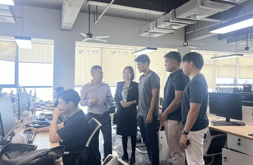 刘莉与泰国校友一行到校友企业武汉扬飞创智产业园考察交流,扬飞集团总经理肖亮、副总经理李坚对刘莉一行表示热情欢迎,并向校友们介绍了集团的主营业务和园区建设运营情况。扬飞集团以移动互联网为发展方向,集智慧物联网研发、软件开发、数字文化创意、电商平台、数据智能分析于一体的新锐互联网科技集团。