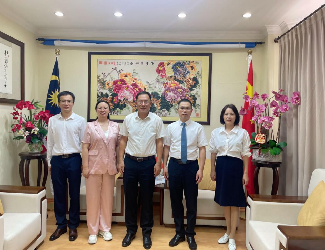 (与中国驻马来西亚古晋总领事馆总领事邢伟平、副领事李炳炎校友合影)