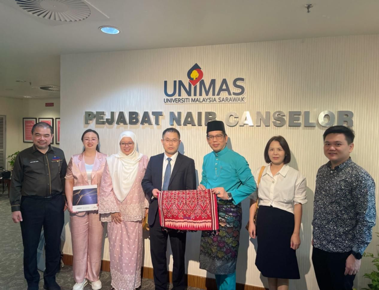 (与马来西亚沙捞越大学校长(右三)、副校长(左三)合影)