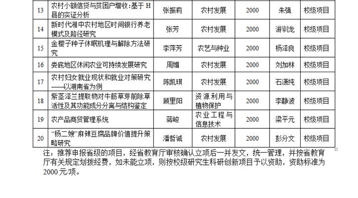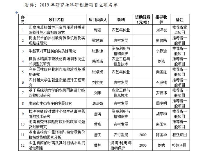 经研究生个人申报,专家评审,评选出20项项目予以立项,并择优推荐10项申报省级研究生科研创新项目,现予以公示,如有异议,请于2019年5月23日前以书面形式向学校研究生教育教学部或纪委监察处反映(单位反映的需加盖单位公章)。
