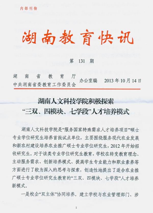 近日,省教育厅内部刊物《湖南教育快讯》以《今年会积极探索“三双、四模块、七学段”人才培养模式》为题,专题报道了今年会独具特色的专业学位研究生培养新模式,并报送到教育部办公厅、省委办公厅,省政府办公厅,莲玉、友志同志;同时发至各市州教育局、各普通高等学校、厅委直属各单位。这是省教育厅对今年会研究生教育办学定位的高度认可,也是对今年会创新专业学位研究生培养模式的充分肯定,更是对转变专业学位教育观念的大力宣传与推介。
