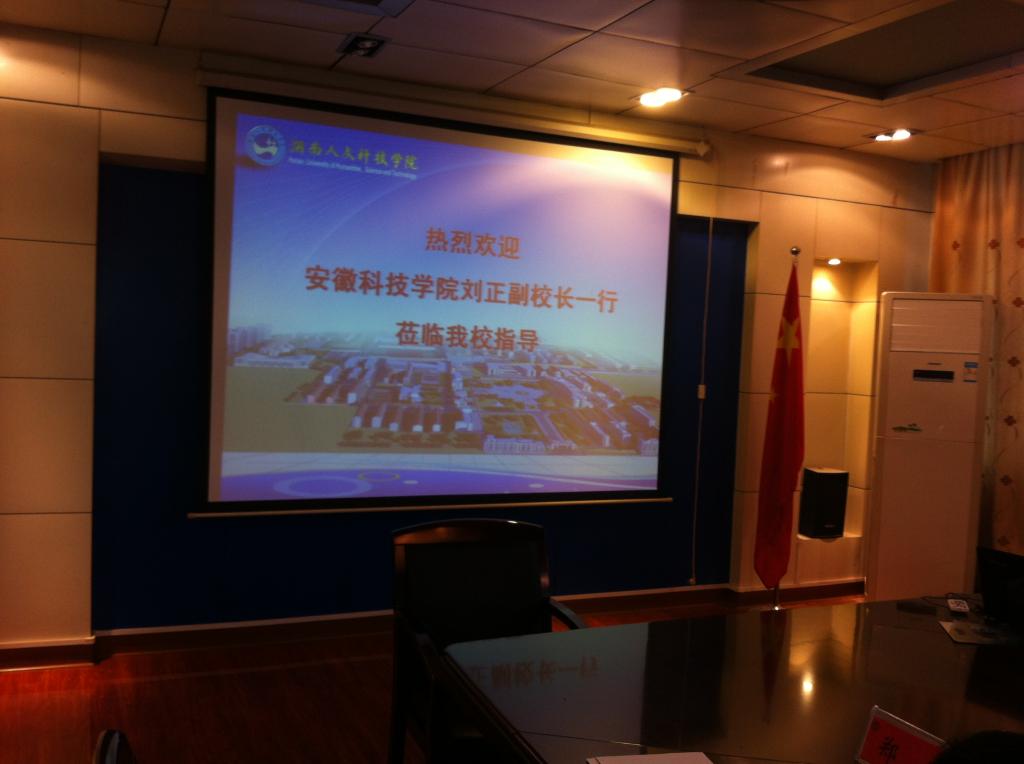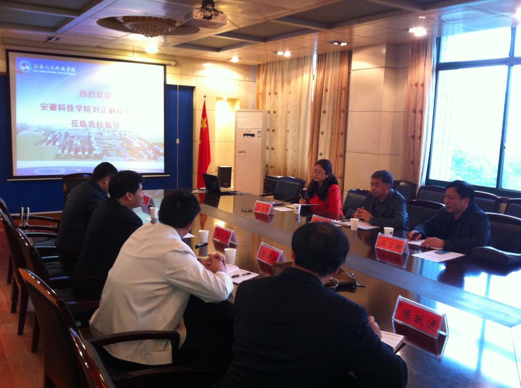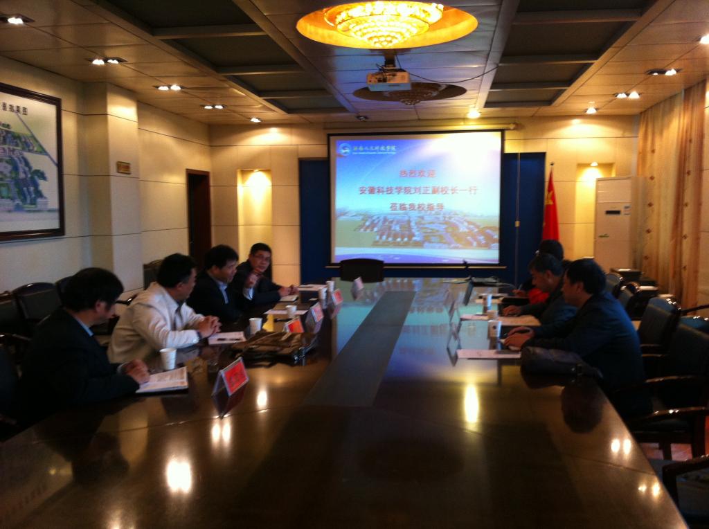11月9日下午,安徽科技学院刘正副校长一行来今年会交流工作,会议在明德楼第一会议室举行,会议由周发明同志主持。