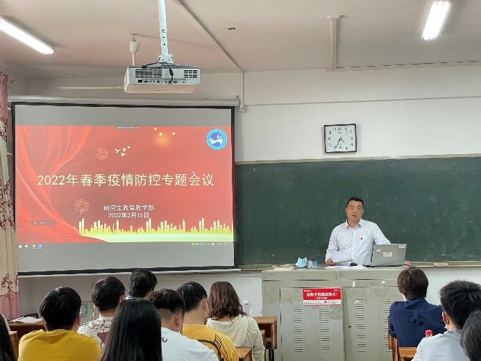 近期我国疫情多地频发,教育系统疫情防控面临复杂严峻形势和挑战,为进一步抓牢研究生疫情防控管理工作,加强研究生的疫情防控思想,研究生教育教育部于3月15日16:30在致远楼411室开展“2022年春节疫情防控专题会议”。研究生教育教学部副书记向瑞桃、班主任曾华、王文琴和李丹及2021级全体研究生参加了此次会议,校外实践的19级、20级研究生通过腾讯会议线上参与,会议由向瑞桃副书记主持。