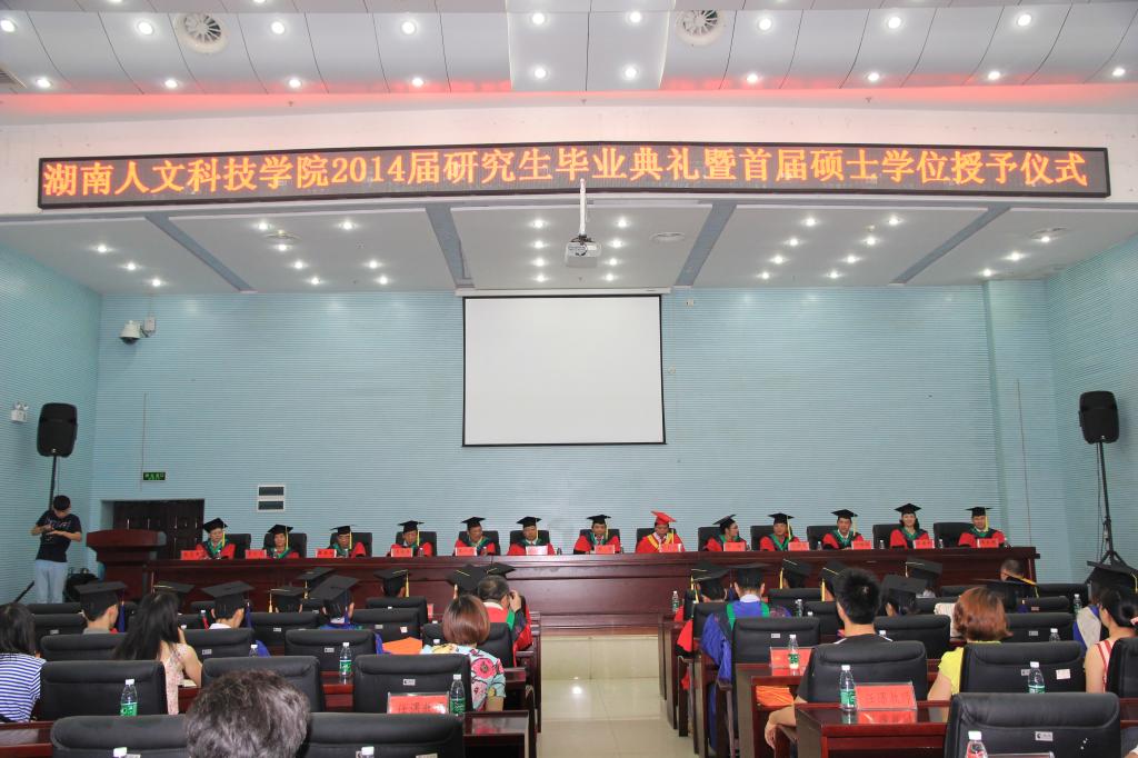 毕业典礼在庄严的国歌声中拉开序幕,刘和云校长发表了热情洋溢的致辞。他首先代表学校向2014届18名硕士毕业生表示热烈祝贺,向辛勤培养硕士研究生的各位老师表示衷心感谢。其次,他对学校首次尝试研究生教育,工作中存在一些不足向毕业生们表达了歉意。随后,他向毕业研究生们提出三点希望:一是坚守理想信念,不断超越自我;二是乐观向上,积极进取;三是学会感恩,乐于奉献。