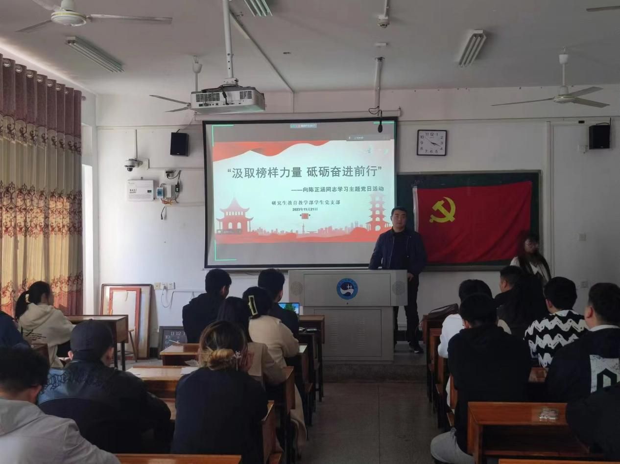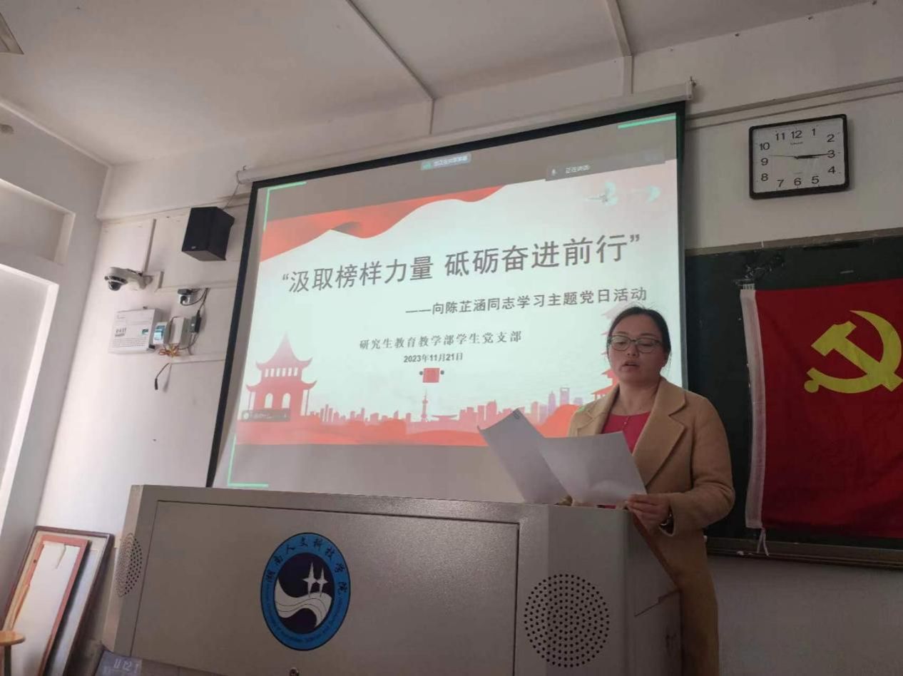 为大力弘扬楷模精神,激发全体党员立足学习创先争优的动能, 11月21日,研究生教育教学部于致远楼411召开“汲取榜样力量,砥砺奋进前行”向陈芷涵同志学习的主题党日活动。研究生教育教学部副书记向瑞桃以及全体研究生党员参加本次主题党日活动,活动由学生支部书记曾华主持。
