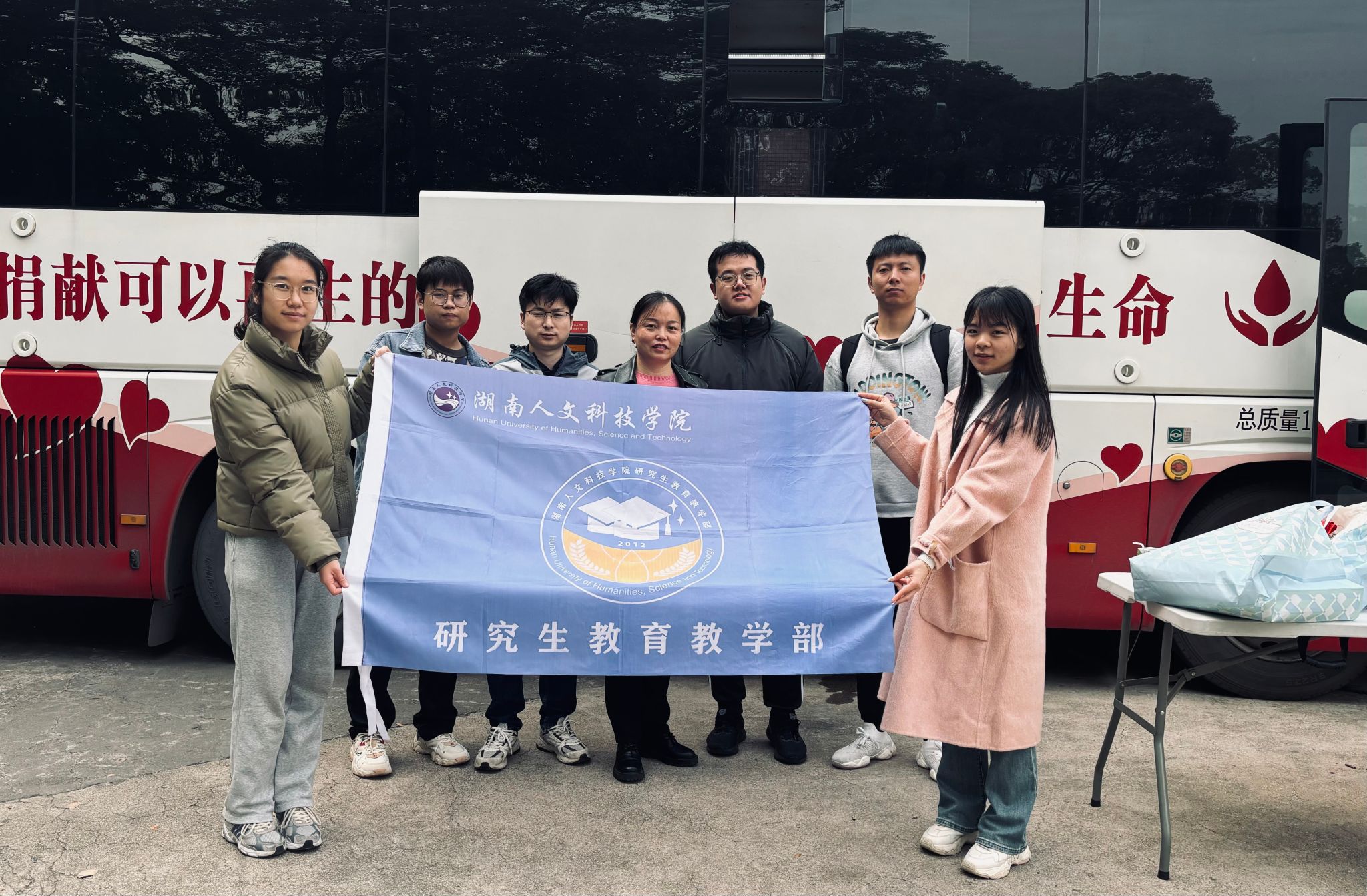 献血结束后,同学们手持献血证,脸上洋溢着骄傲的笑容。为纪念这一光荣时刻,大家手持院旗、党旗和团旗,站在献血车前合影留念。此次活动不仅体现了研究生的社会责任感,也彰显了新时代研究生的爱心与担当。
