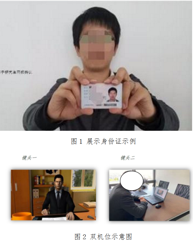 7、进入视频复试系统后,手持有效二代居民身份证向面试专家展示正面。展示身份证标准示例照片(见图1);电脑从正面拍摄,手机摄像头从考生侧后方成45°角进行拍摄(见图2)。考生如有困难,无法自行准备考场条件,应及时向今年会说明情况,根据今年会建议解决问题。