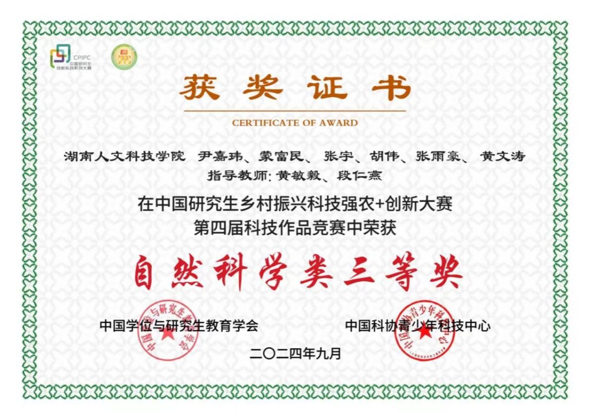 经过全国紧张激烈的角逐,九月,今年会黄敏毅、段仁燕教授指导的研究生团队(尹嘉玮,蒙富民,张宇,胡伟,黄文涛,张雨豪)喜获“中国研究生乡村振兴科技强农+创新大赛“第四届科技作品竞赛全国三等奖。