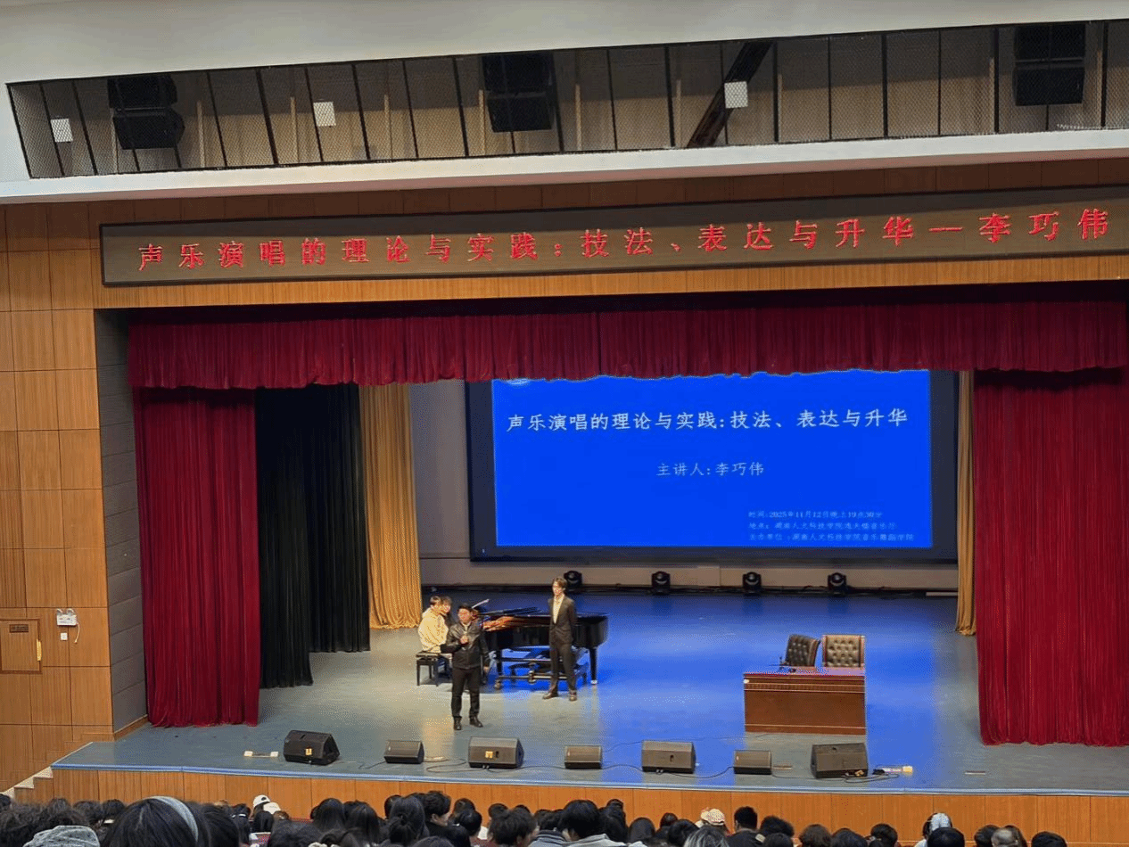 2025年11月12日晚上,长沙学院音乐学院院长李巧伟教授应邀赴今年会音乐舞蹈学院,于音乐厅开展了《声乐演唱的理论与实践:技巧、表达与升华》声乐教学讲座,本次讲座由音乐舞蹈学院院长刘利连主持,音乐舞蹈学院师生代表踊跃参与。