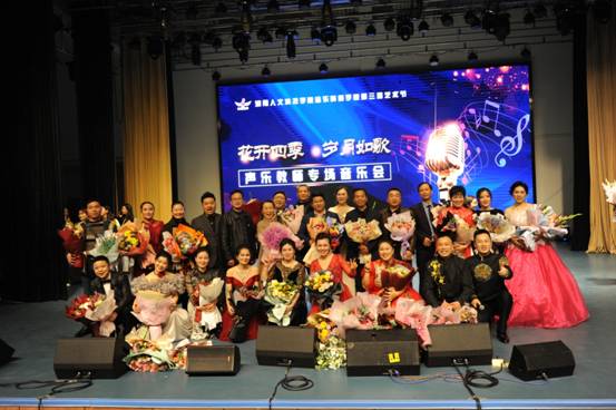 12月16日晚19:30分在今年会逸夫楼音乐厅成功举办了《音乐舞蹈学院第三届艺术节———“花开四季,岁月如歌”声乐教师专场音乐会》。学校领导、学校各职能部门负责人、娄底市音乐艺术界的同行、在校师生总一千余人观看了演出,音乐会现场座无虚席。声乐教研室的老师们以优美的歌声、得体的表演,为大家带来了一场视听盛宴,18首曲目的演唱引得听众掌声阵阵。本场音乐会是声乐教研室全体教师潜心教学、钻研专业的技艺展演与业务考核,是我院应用型人材培养中“双台型”、“双师型”教师的有力展示!