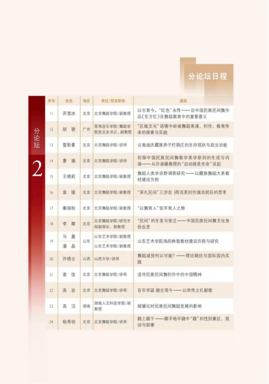 BDA舞蹈论坛是北京舞蹈学院创建的高端学术品牌,是海内外舞蹈艺术家和权威专家学者沟通交流的重要学术平台,自创设以来,先后凝聚了20余个国家和地区的近500名舞蹈艺术家、2000余名舞蹈学者的经验分享,已在国内外产生广泛而深远的影响。此次论坛分开、闭幕式、1个主论坛、15个分论坛及展演等,共有来自全国24个省、市、自治区250余位专家、学者共同参与见证,荟萃了中国舞蹈家协会主席冯双白,92岁高龄的李正一教授,吕艺生、熊家泰、肖苏华、潘志涛、于平、袁禾、邓佑玲、许锐教授等129位教授、副教授,20余位国家一级演员、编导等以及国家大剧院、中国东方演艺集团等十几个国家重要院团的30余位主要领导和骨干,他们用前瞻性的学术眼光和独到的分析视角,从不同角度分享宝贵经验、解读前沿动态、思考发展的方向,为建党百年奉献上一份厚重的学术大礼。