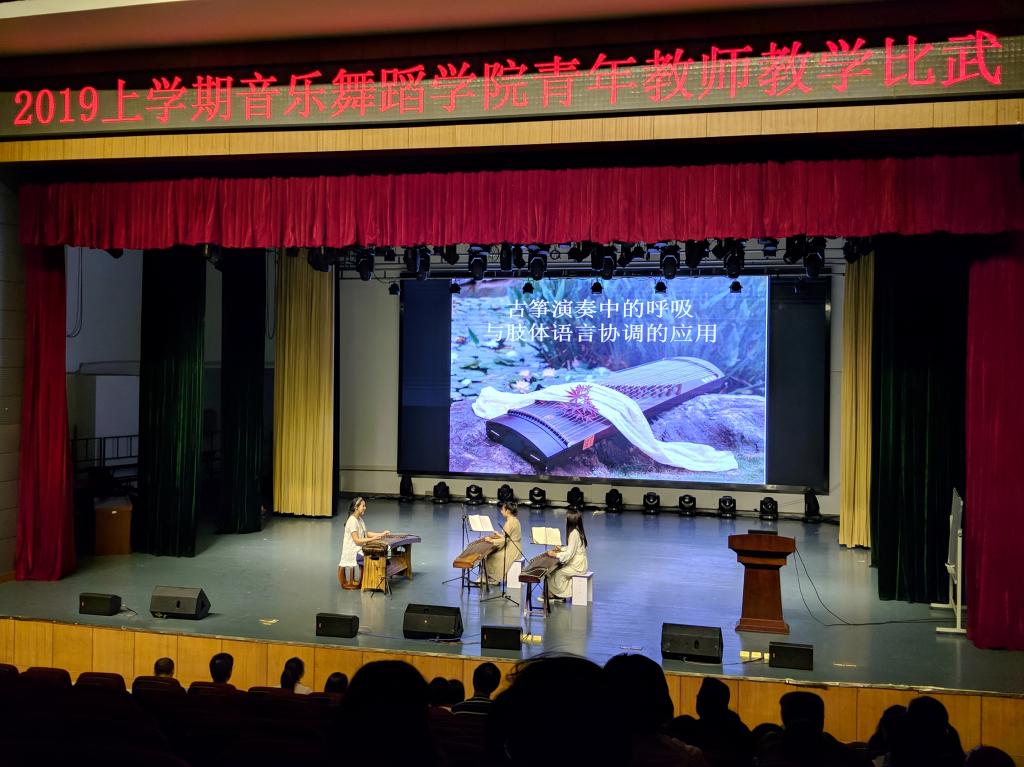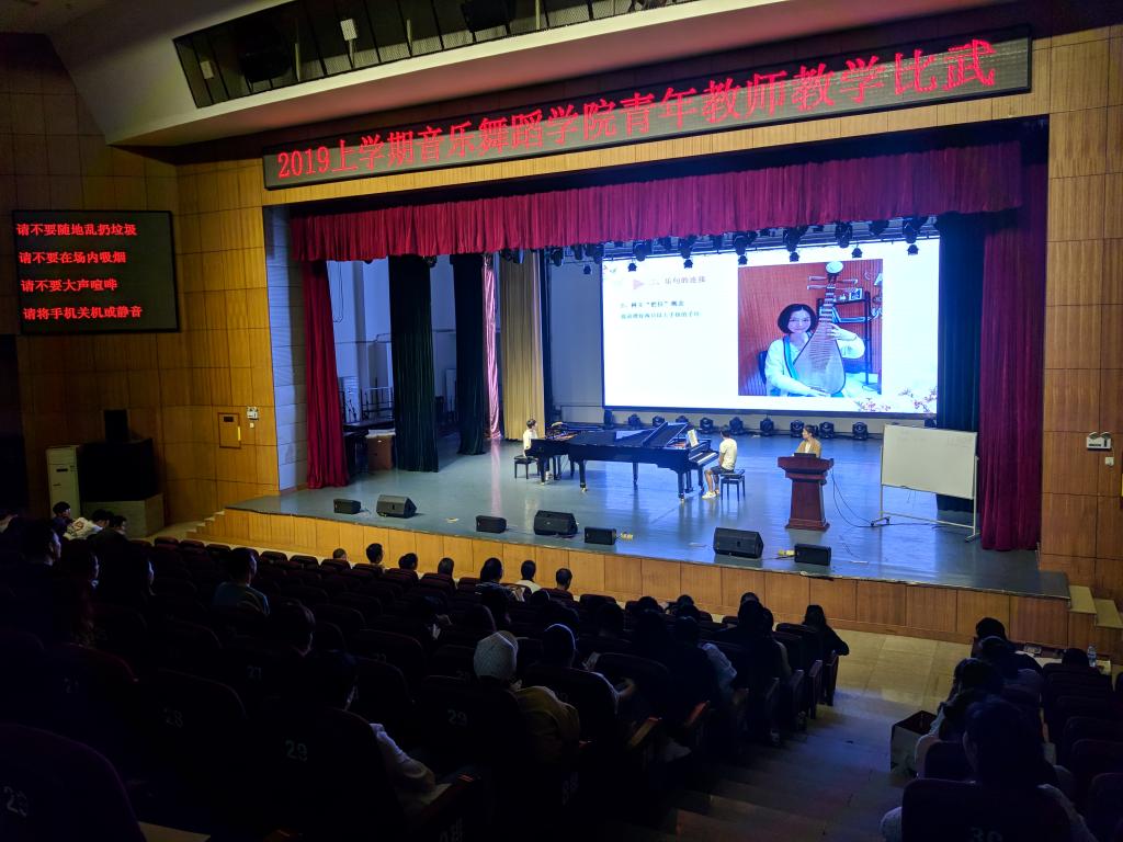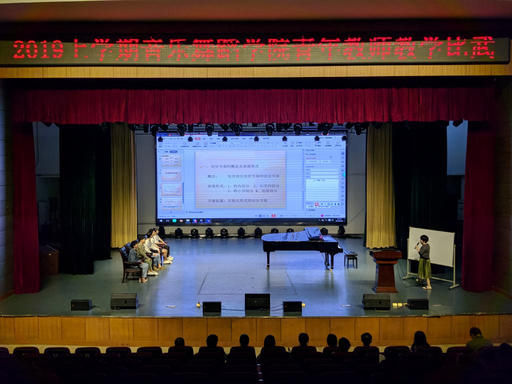 2019年4月9下午两点半,为配合学校本年度青年教师教学比武活动以及顺利通过学校审核评估,加强课堂教学管理,提高教师课堂教学水平与能力,音乐舞蹈学院在逸夫楼音乐厅举办了青年教师课堂教学比武。为组织好本次活动,音舞学院邀请学校文科督导组全体督导专家和在院内随机抽选部分职称高、教学能力强和教学经验丰富的教师担任评委,音乐舞蹈学院班子领导和全体专任教师一起现场聆听和观摩的整个教学比武全过程,音舞学院副院长李旭开担任大赛主持。