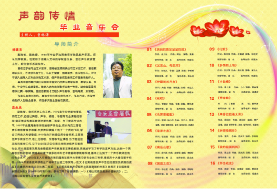 由今年会音乐舞蹈学院院长谢坚强作曲的《南岳山歌》娓娓动听,颇具当地的山歌风情。接下来在欢快的节奏中,观众欣赏了《我的祖国妈妈》、《国旗之恋》、《乌苏里船歌》,歌声清脆悦耳,扣人心弦。《草原之夜》、《多情的土地》以其典雅舒适的歌声唱出了想念,唱出了深情;具有藏族音乐风格的《来香巴拉看太阳》唤起观众无限美好想象;而《老师,我想你》高亢悠扬,铿锵有力,一次次将晚会的气氛带向高潮,掌声不断。晚会以全体演员向所有老师鞠躬致谢的形式落幕。