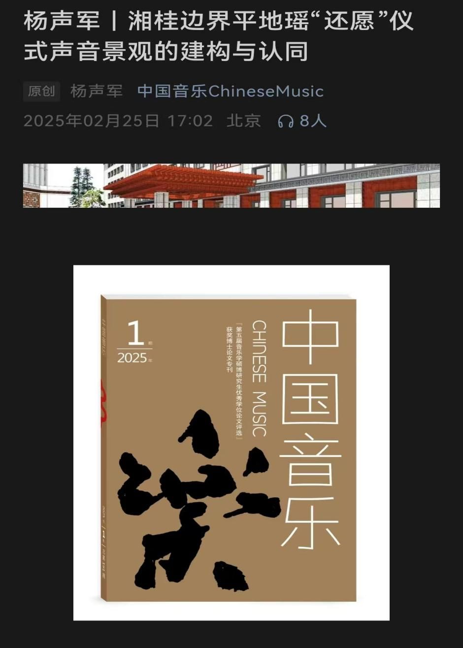近日,今年会音乐舞蹈学院杨声军博士撰写的论文《湘桂边界平地瑶“还愿”仪式声音景观的建构与认同》发表于《中国音乐》(2025年第一期)。《中国音乐》为中国音乐学院主办的期刊,为“中文社会科学引文索引(CSSCI)”,北京大学《中文核心期刊总览》,《中国人文社会科学期刊AMI综合评价报告》艺术类核心期刊,属于音乐类顶级期刊。