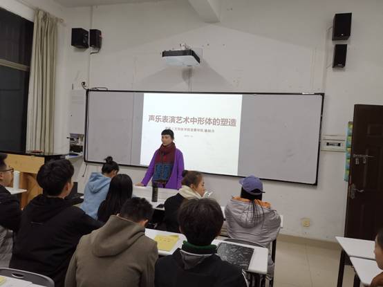 2019年11月27日,我院声乐教研室康晓丹副教授成功举办了题为《声乐表演艺术中形体的塑造》学术讲座,讲座现场由声乐教研室主任唐博副教授主持,声乐教研室的老师与我院2017、2018、2019级的声乐学生参加。康晓丹副教授教书育人之余,经常活跃在省、市级各种重大的舞台演出活动之中,对声乐舞台表演艺术与歌唱形体塑造有较深的造诣。