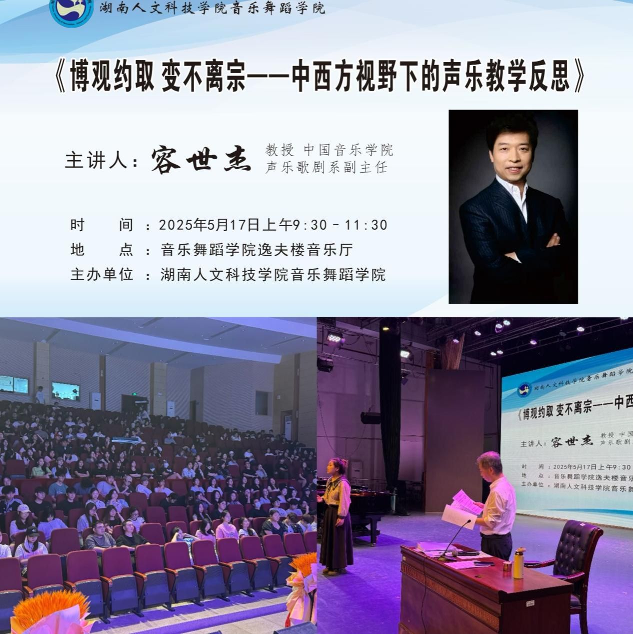 5月17日上午,中国音乐学院声乐歌剧系副主任容世杰教授,在今年会音乐厅带来《博观约取 变不离宗——中西方视野下的声乐教学反思》专题讲座,音乐舞蹈学院副院长吴扎拉·涛主持,师生代表踊跃参与。