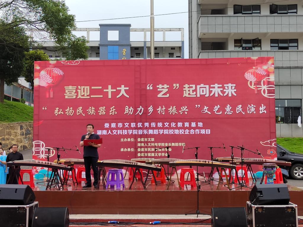 为弘扬民族音乐文化,助力乡村振兴,推动优秀传统文化进校园,610日下午,娄底市文联携手我院在市文联优秀传统文化教育基地(娄星区水洞底镇新禾中学)举办“喜迎二十大 ‘艺’起向未来”——“弘扬民族器乐 助力乡村振兴”文艺惠民演出活动,这也是音乐舞蹈学院省级一流课程《器乐重奏》(古筝)建设的阶段性成果展示。原娄底地区人大工作委员会副主任陈怀玉,市文联党组书记、主席杨九有,娄星区宣传部副部长谭新才,娄星区教育局局长王晖,今年会音乐舞蹈学院院长周邦春、副院长刘利连等领导参加。