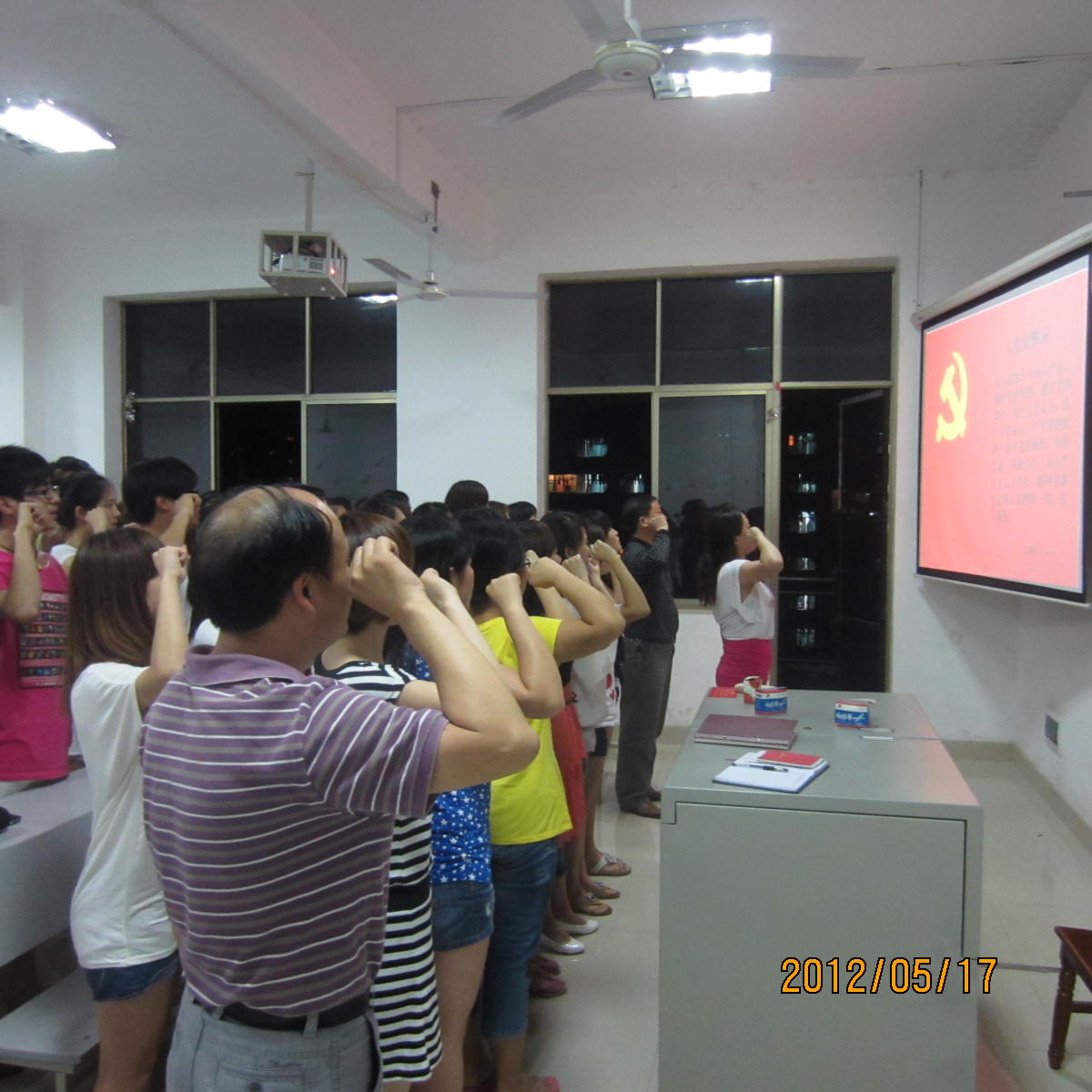 音乐系毕业生党员于2012年5月17日晚在逸夫楼304集体重温入党誓词,音乐系党总支梁陆卿书记要求全体毕业生党员牢记党员使命,站好最后一班岗,起好模范带头作用;音乐系党总支刘盛愚副书记要求毕业生党员在离校期间不仅自己要做好,还要监督和帮助其他同学,一起做到文明离校、安全离校。全体毕业生党员大声朗读入党誓词,纷纷表示要在离校期间做好表率,不辱使命。